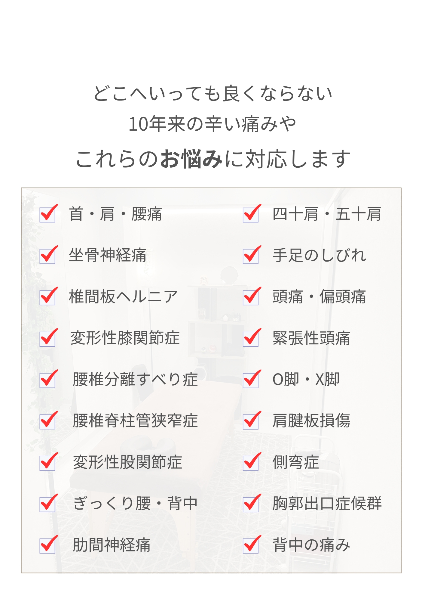 腰痛、坐骨神経痛、脊柱管狭窄症、膝の痛みなど病院、整骨院、他の整体院へいっても良くならなかった方の多くが当院の治療で改善している方がいらっしゃいます。